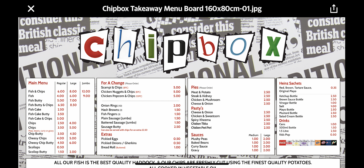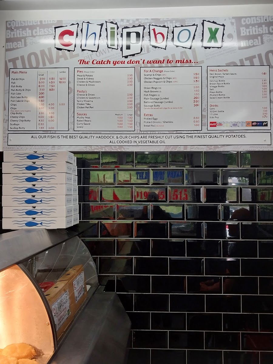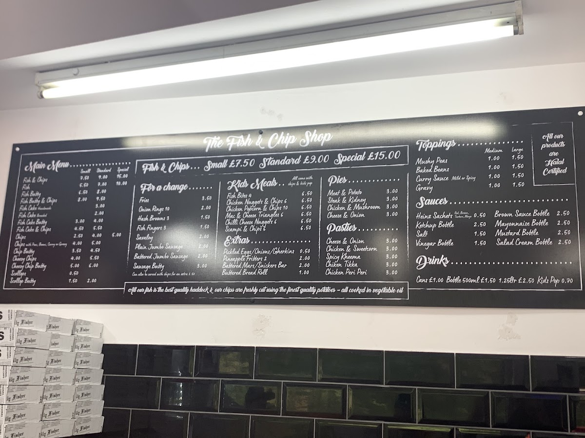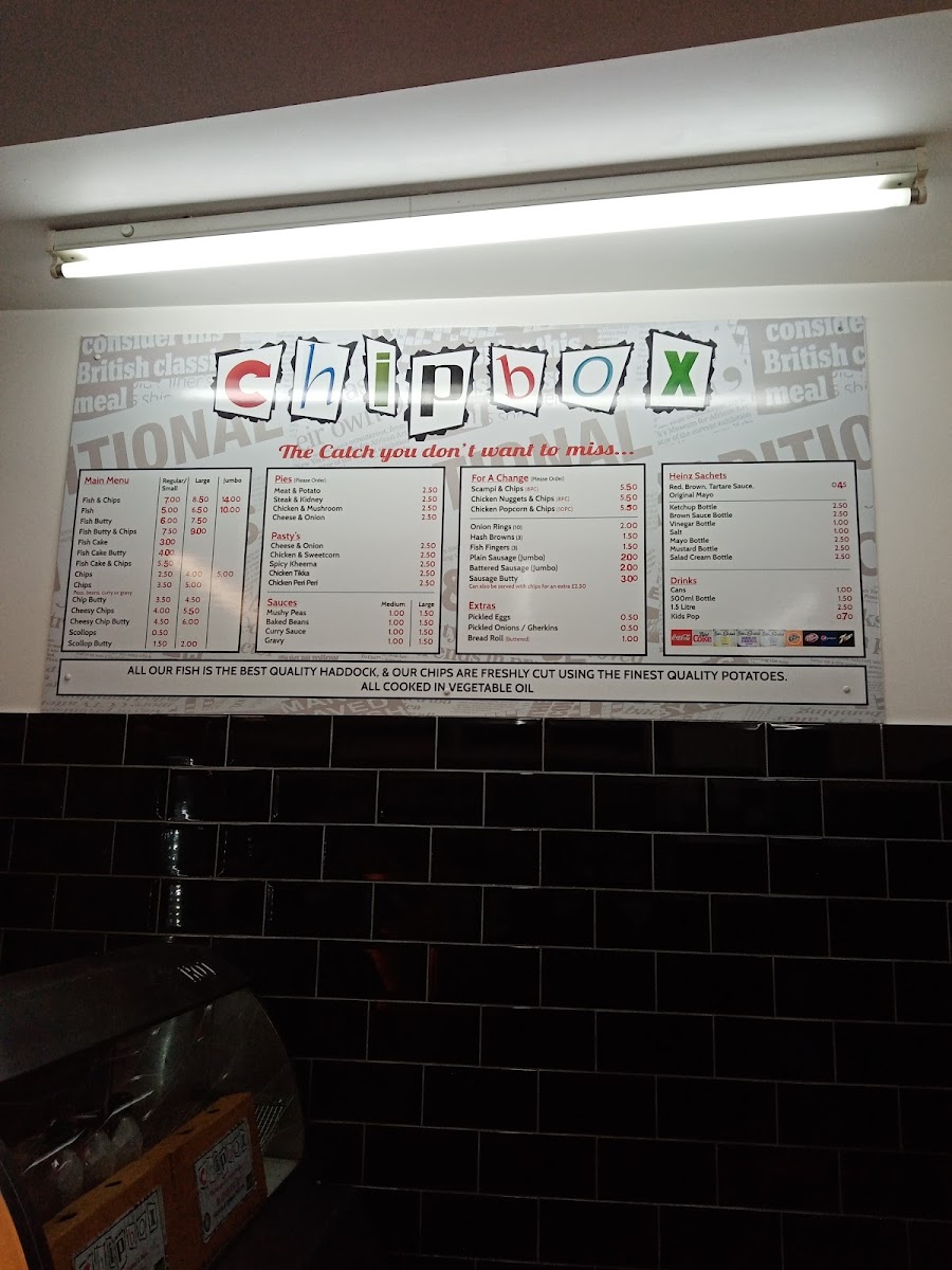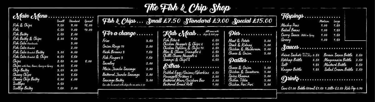 This menu is structured to cater to those seeking traditional British takeaway, with straightforward options suitable for lunch, dinner, or casual snack times. It is primarily designed for quick ordering and takeaway service at the location.